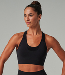 89% polyester/11% elastane. Seamless knit.Racer back style.Self fabric bound neckline, armholes and back.Mesh inserts on front and back.Removable padded cups.Tear out label.