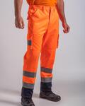 HV Orange/Navy and HV Yellow/ Navy certified to EN ISO 20471:2013+A1: 2016 Class 1, HV Orange/Navy also conforms to RIS/3279/TOM Issue 1:2016, Navy colourway non certified, Water repellent finish, Side elasticated waistband with seven belt loops, Zip fly fastening, Two side seam pockets and two cargo pockets, One rear pocket with tear and release fastening, Internal knee pad pockets, Two bands of reflective tape around leg
